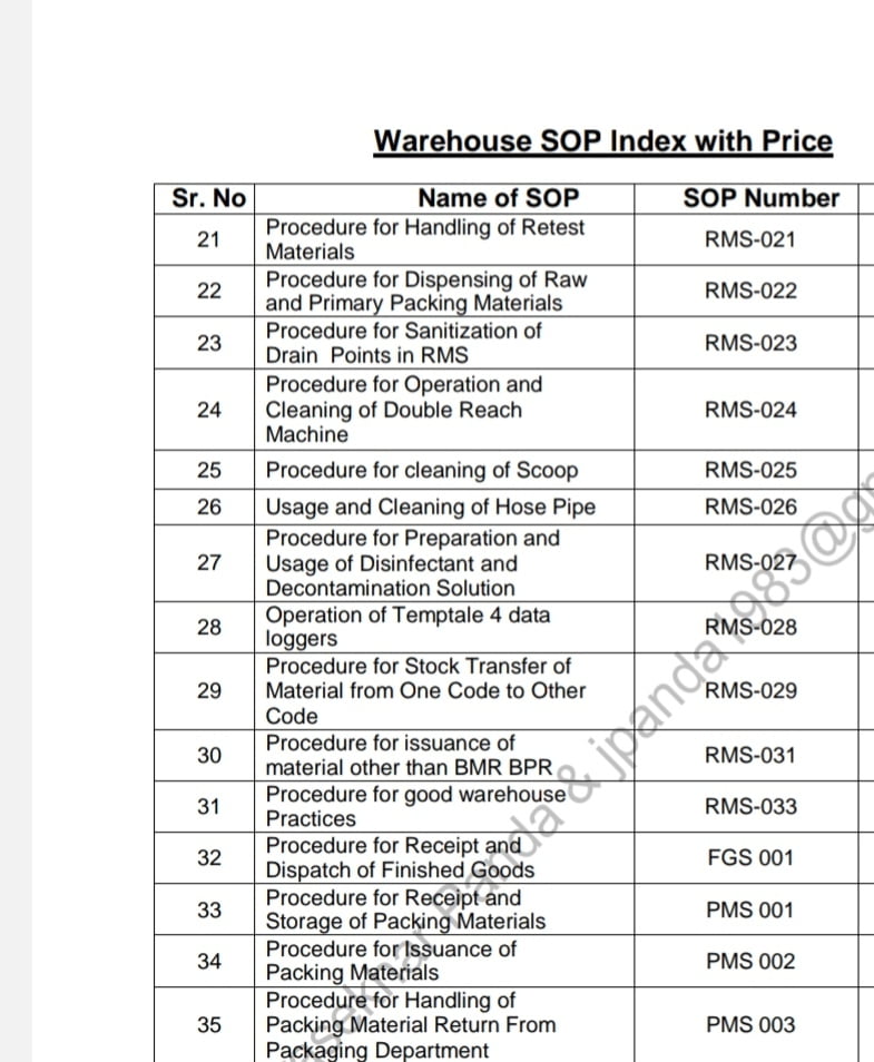 Warehouse Department SOPs Index is attached and interested persons can contact me on cspandapharmaconsultant@gmail.com to purchase