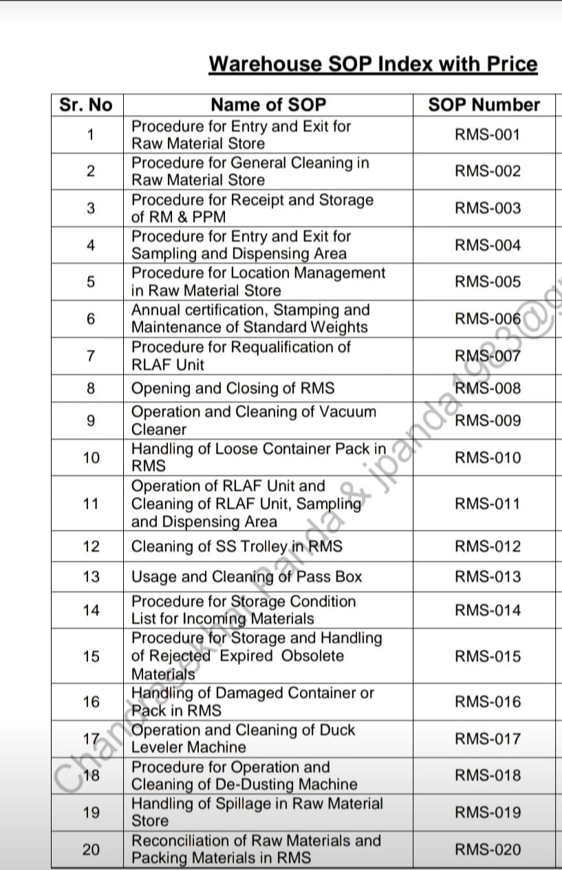 Warehouse Department SOPs Index is attached and interested persons can contact me on cspandapharmaconsultant@gmail.com to purchase
